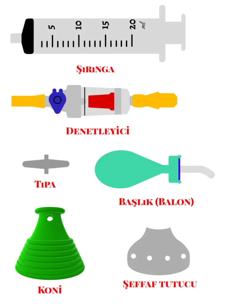 Denetleyici herhangi bir sebepten dolayı arızalanırsa aleti denetleyici olmadan manuel olarak kullanmak için, denetleyicinin uçlarındaki silikon bağlantı parçası yerinden sökülerek balon başlığın ucuna takılır. Şırıngayla balona hava bastıktan sonra basıncın kaçmasını önlemek için silikon bağlantı parçası elle sıkılır ve şırınga çıkarılır. Bu sırada hava kaçmaması için silikon bağlantı parçası elle sıkılmaya devam edilir. Ardından silikon bağlantı parçasına tıpa takılarak basıncın korunması sağlanır. Yukarıdaki resimde denetleyici olmadan manuel kullanım yapıldığında aletin parçalarının diziliş şekli görülmektedir.
