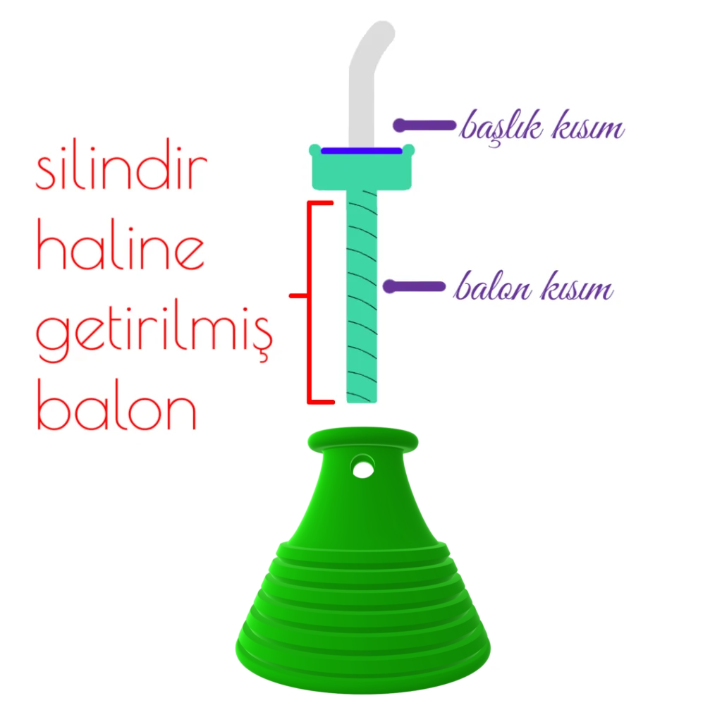 Balon dürüldükten sonra koni kanalından içeriye doğru ucu sokulur. Silindir haline getirilen balonun ucu koniye girdikten sonra balonun kalan kısmı tıpkı bir vida gibi çevrilerek rahatça koniye takılmaktadır.