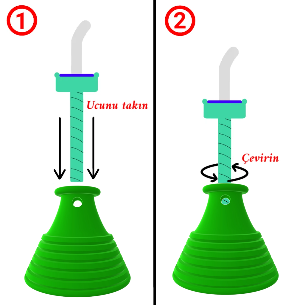 Başlıklar koni kanalından içeriye sokularak takılmaktadır. Koni kanalı başlıkları takmak için yeterli genişliğe sahiptir. Başlıkları koni kanalına rahatça sokmak için balon kısım dürülerek silindir haline getirilmelidir.