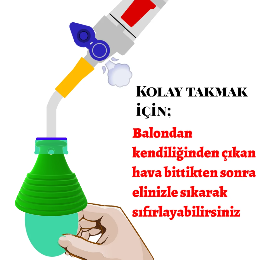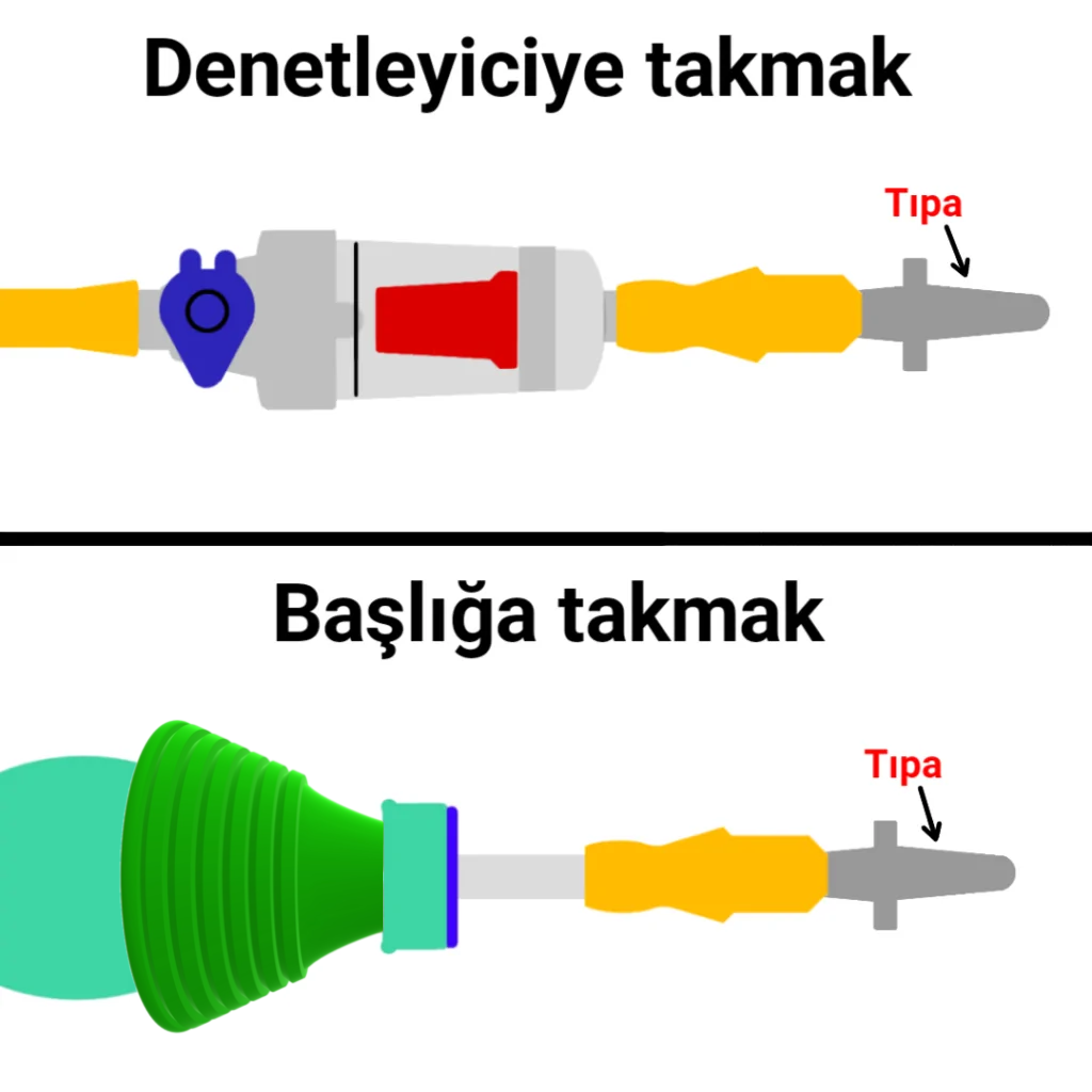 Denetleyicinin her iki ucunda silikon bağlantı uçları mevcuttur. Denetleyicinin mavi kapağının bulunduğu uca balonun hortumu takılmalıdır. Diğer uca ise şırınga takılmalıdır. Yukarıdaki resimde denetleyicinin doğru yönde takılmış hali görülmektedir.